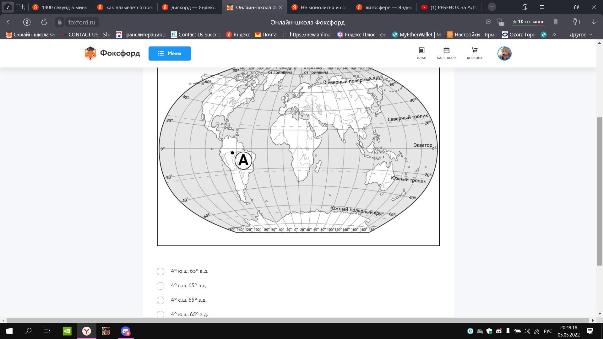 4° Ю.ш. 65° З.ш. правильный ответ самый нижний