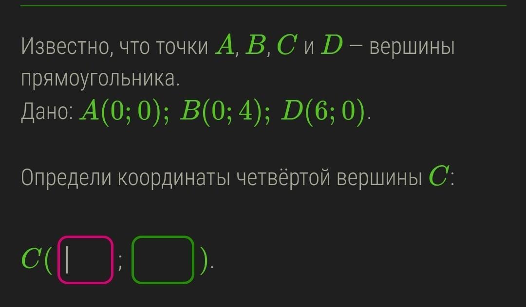 Нам достаточно провести условные линии от координат точки B и D. После этого посмотреть место пересечения этих линий. Это и есть последняя вершина С.