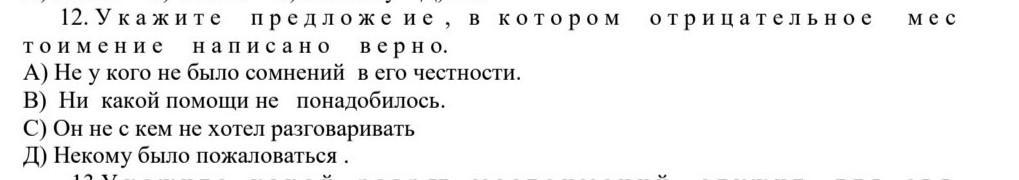 Почему? Потому, что в А) есть ошибка: пишем НИ У КОГО; Б) НИКАКОЙ слитно пишется; В) НИ с кем.