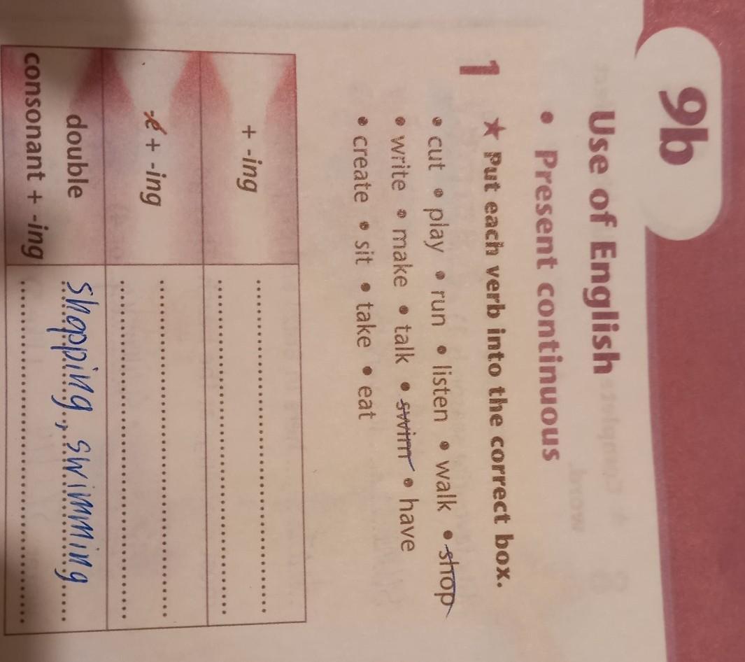 cutting, playing , running, listening, walking, shopping, writing, making, talking, swimming, having, creating, sitting, taking, eating