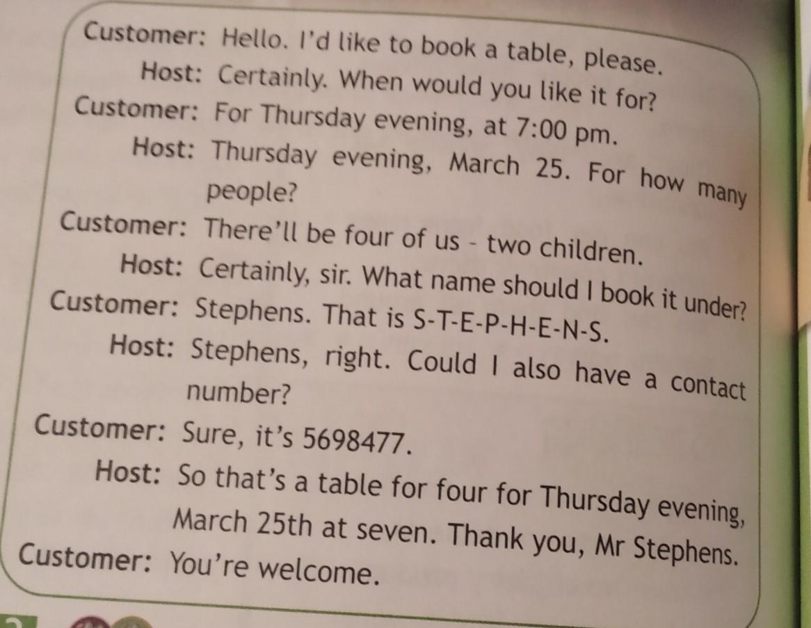 Portfolio: It's your father's birthday next Tuesday. You and your brother/sister are planning a surprise dinner party at a famous restaurant. Make a phone call to reserve a table. In pairs, take the roles of a customer and a manager and act out the dialogue. Record yourselves.