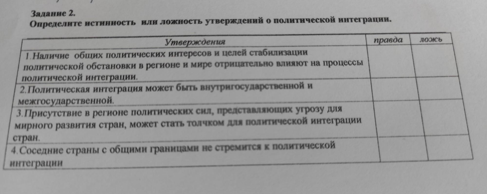 Задание 2. Определите истинность или ложность утверждений о политической интеграции. правда ложь Утверждения 1.Наличие общих политических интересов и целей стабилизации политической обстановки в регионе и мире отрицательно влияют на процессы политической интеграции. 2. Политическая интеграция может быть внутригосударственной и межгосударственной. 3.Присутствие в регионе политических сил, представляющих угрозу для мирного развития стран, может стать толчком для политической интеграции стран. 4.Соседние страны с общими границами не стремится к политической Интеграции