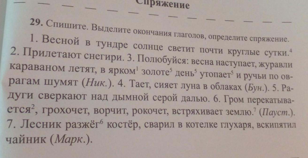 Весной в тундре солнце светИТ (II спряжение) почти круглые сутки. ПрилетаЮТ (I спряжение) снегири. Полюбуйся: весна наступаЕТ (I спряжение), журавли караваном летЯТ (II спряжение) в ярком золоте день утопаЕТ (I спряжение) и ручьи по оврагам шумЯТ (II спряжение). ТаЕТ (I спряжение), сияЕТ (I спряжение) луна в облаках. Радуги сверкаЮТ (I спряжение) над дымной серой далью. Гром перекатываЕТся (I спряжение), грохочЕТ (II спряжение), ворчИТ (II спряжение), рокочЕТ (II спряжение), встряхиваЕТ (I спряжение) землю. Лесник разжёг (нулевое окончание, I спряжение) костёр, сварил (нулевое окончание, II спряжение) в котелке глухаря, вскипятил (нулевое окончание, II спряжение) чайник.