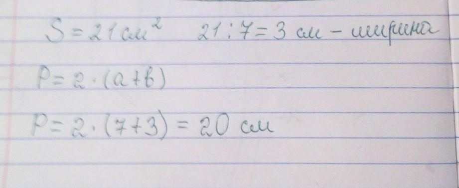 задачу. Найди периметр прямоугольника, если решению площадь прямоугольника 21 см, а длина 7 см.