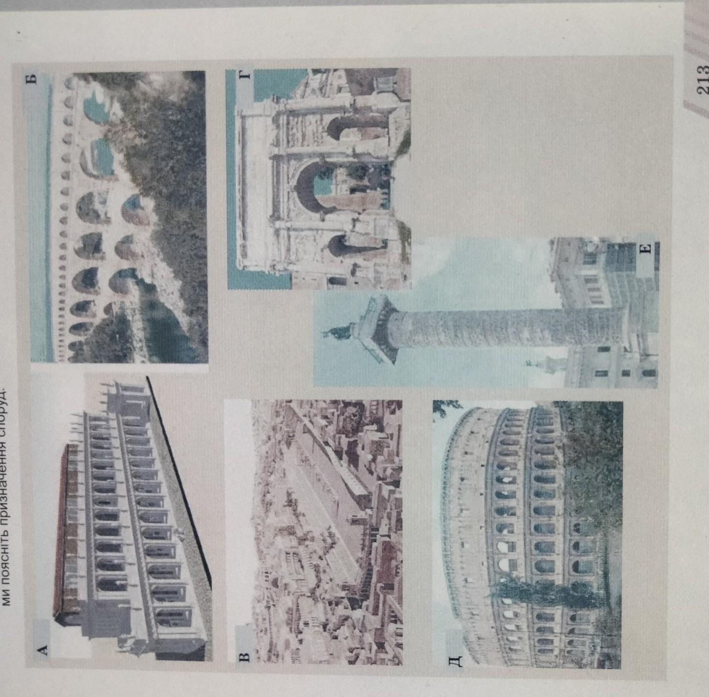 Працюймо самостійно. Завдання 2. Роздивіться ілюстрації, на яких зображено: 1) найвищий давньоримський акведук Пон-дю-Гар (Франція); 2) найбільшу спо- руду тогочасного Рима - Великий цирк (реконструкція); 3) найвідоміший амфі- театр Флавіїв - Колізей; 4) арку Септимія Севера з римського форуму; 5) базиліку Ульпія на форумі Траяна (реконструкція); 6) колону імператора Марка Аврелія. Установіть відповідність між назвами та зображеннями, одним-двома речення- ми поясніть призначення споруд