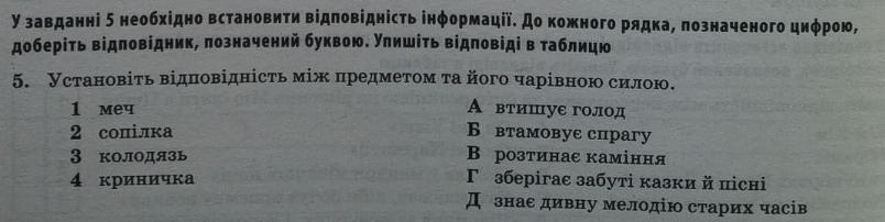 1 В розтинає камінь ; 2 Д знає дивну мелодію старих часів ; 3 Г зберігає забуті казки й пісні ; 4 Б втамовує спрагу