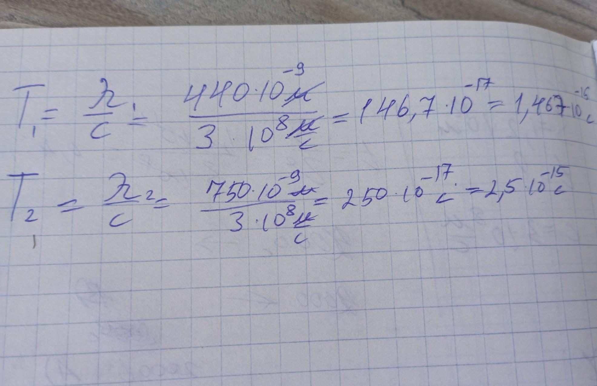 Які періоди коливань відповідають крайнім червоним (λ =750 нм) і крайнім фіолетовим (λ=440 нм) промінням видимої частоти спектра?