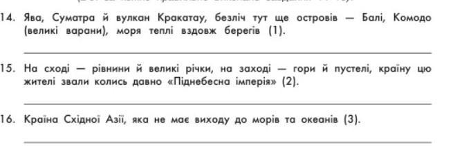 14. Ява, Суматра й вулкан Кракатау, безліч тут ще островів — Балі, Комодо (великі варани), моря теплі вздовж берегів (1). 15. На сході — рівнини й великі річки, на заході — гори й пустелі, країну цю жителі звали колись давно «Піднебесна імперія» (2). 16. Краіна Східної Азії, яка не має виходу до морів та океанів (3).