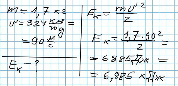 Сокіл-сапсан під час полювання розвиває швидкість 324 км/год. Знайдіть кінетичну енергію соколу, якщо його маса дорівнює 1,7 кг. Відповідь подати в кДж.