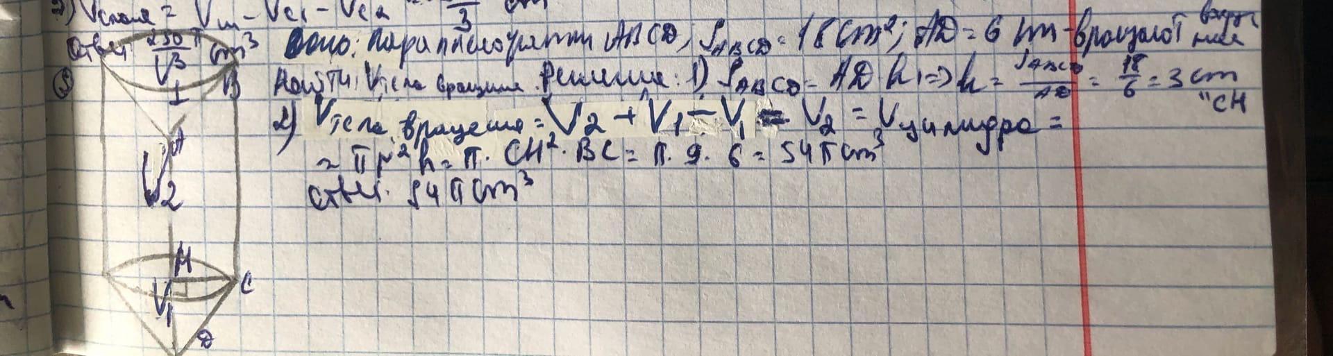 Параллелограмм, площадь которого равна 18 см2, вращается вокруг стороны, равной 6см. Найдите объем тела вращения.