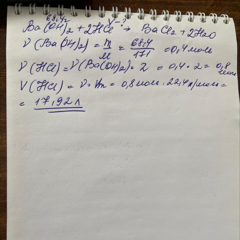 Обчисліть об'єм хлороводню (за н. у.), що прореагує з розчином, у якому міститься 68.4 гбарій гідроксиду.