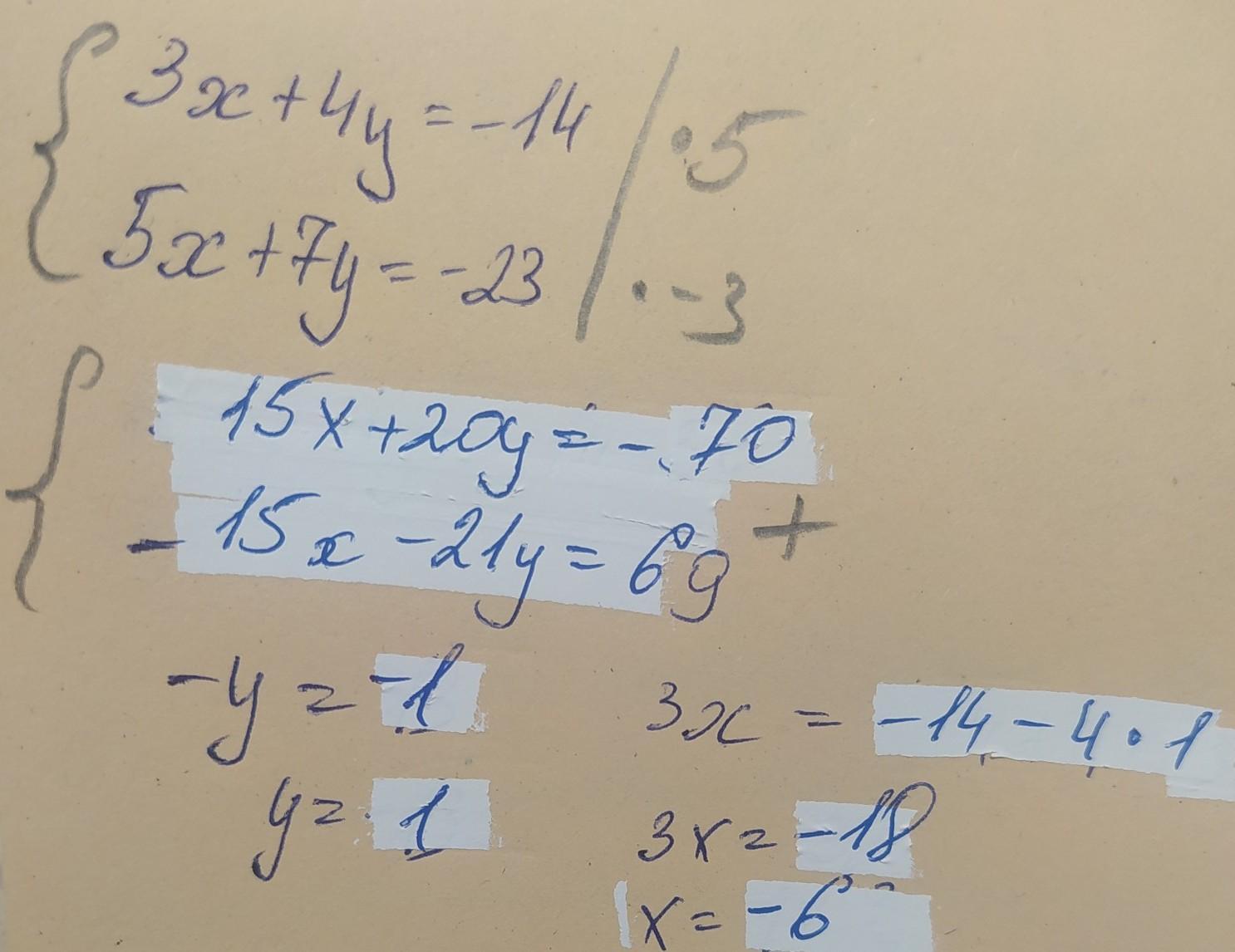 розв яжіть систему рівнянь способом додавання 3x+4y=-14 5x+7y=-23