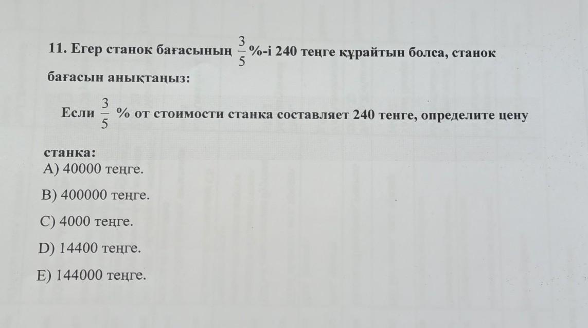 Если 3/5 % от стоимости станка составляет 240 тенге, определите цену станка: