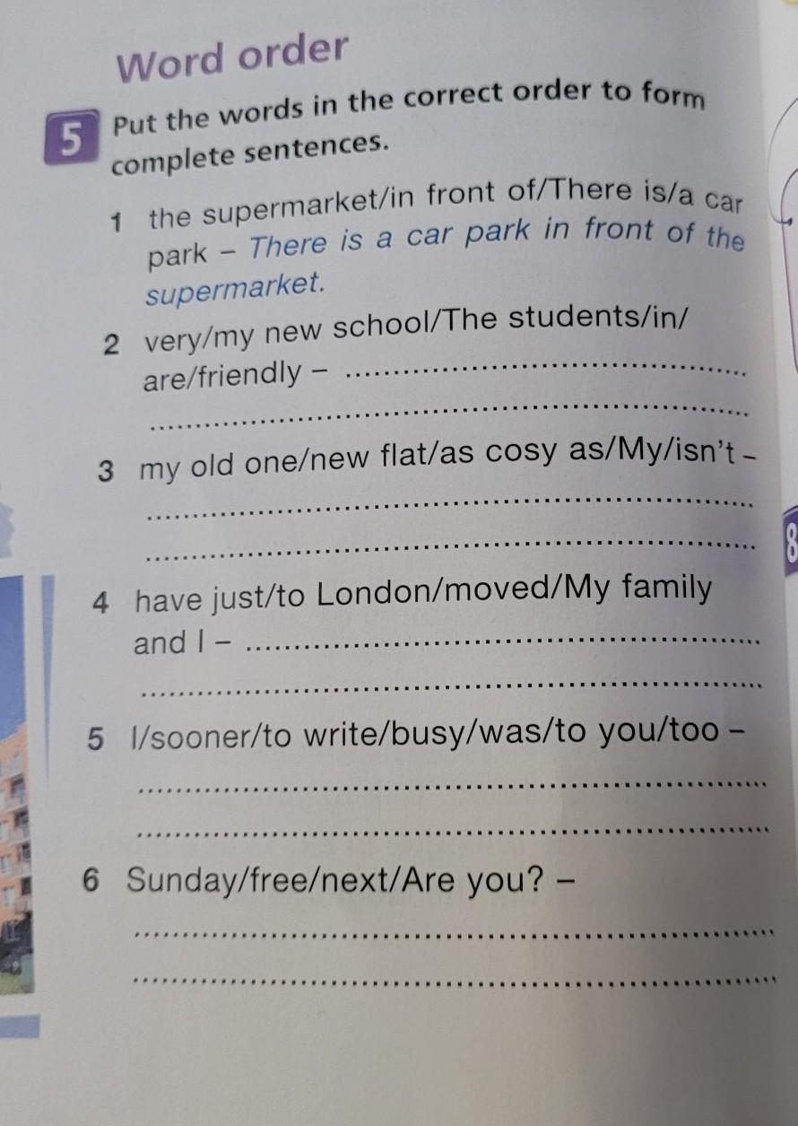 1 the supermarket/in front of/There is/a car park There is a car park in front of the supermarket