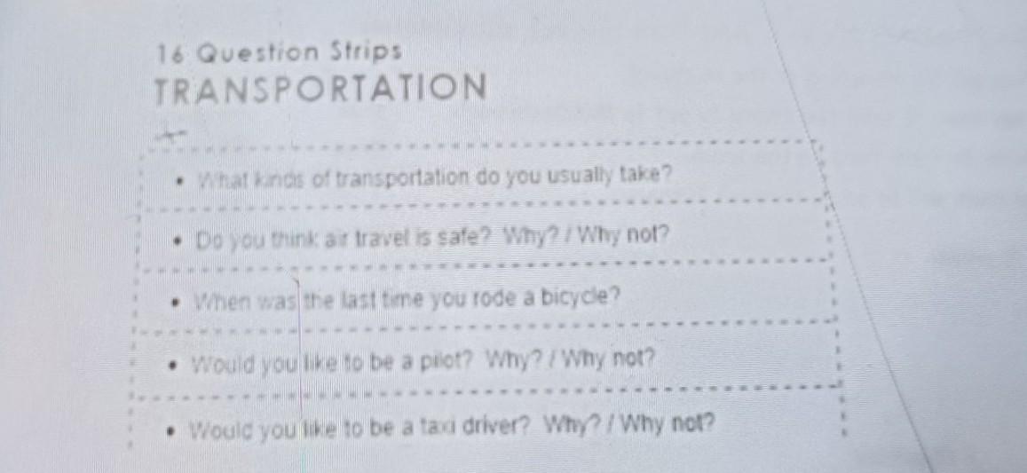 Speaking. Answer these questions. 16 Question Strips TRANSPORTATION • What kinds of transportation do you usually take? • Do you think air travel is safe? Why? / Why not? • When was the last time you rode a bicycle? . Would you like to be a pilot? Why? Why not? . Would you like to be a taxi driver? Why? / Why not? 5 points хелп кто ответит тупо даю бан