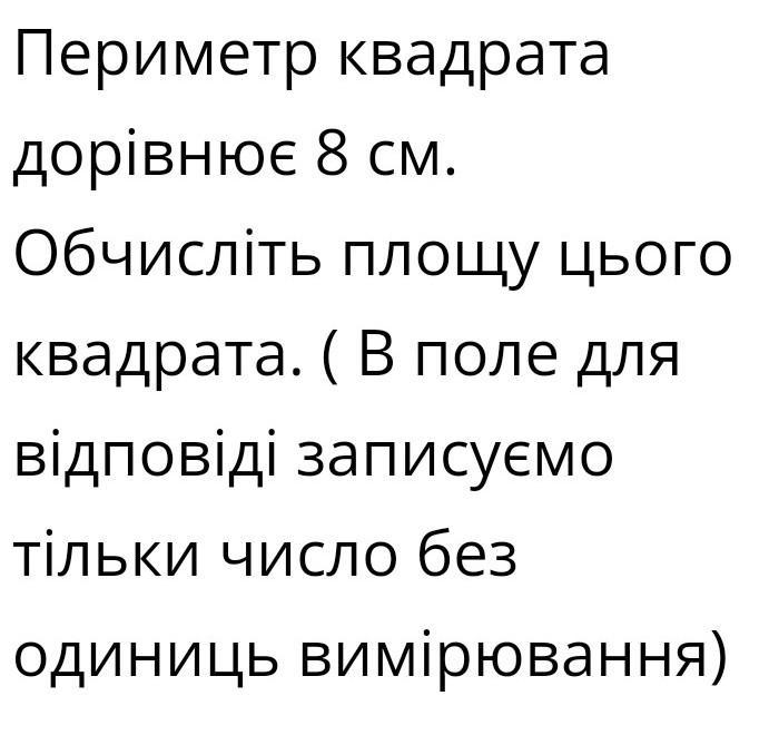 срочно помогите :Периметр квадрата дорівнює 8 см. Обчисліть площу цього квадрата. ( В поле для відповіді записуємо тільки число без