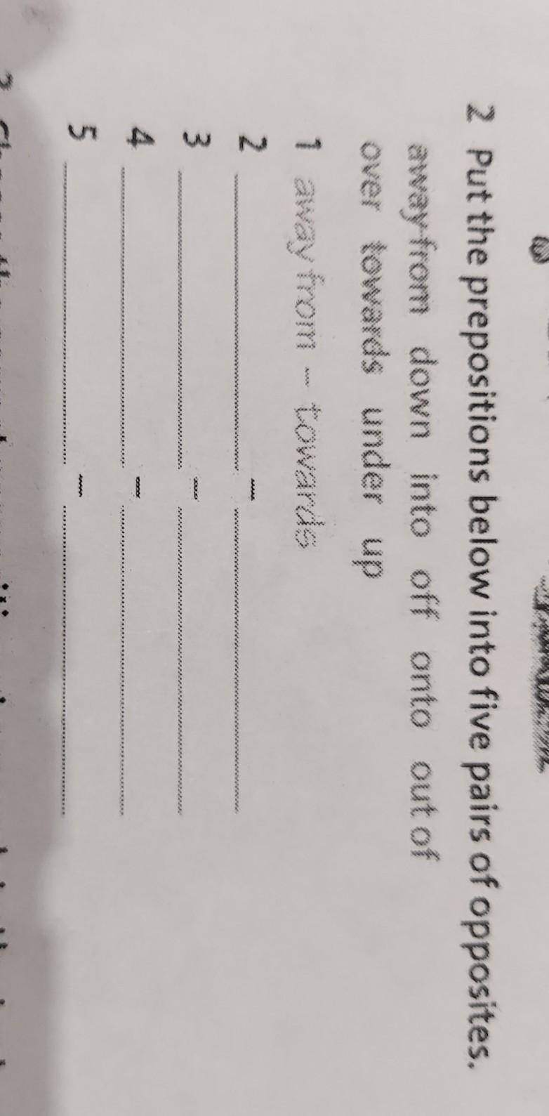 2 Put the prepositions below into five pairs of opposites. away from down into off onto out of over towards under up 1 away from - towards - 2. 3 www i w 4 5