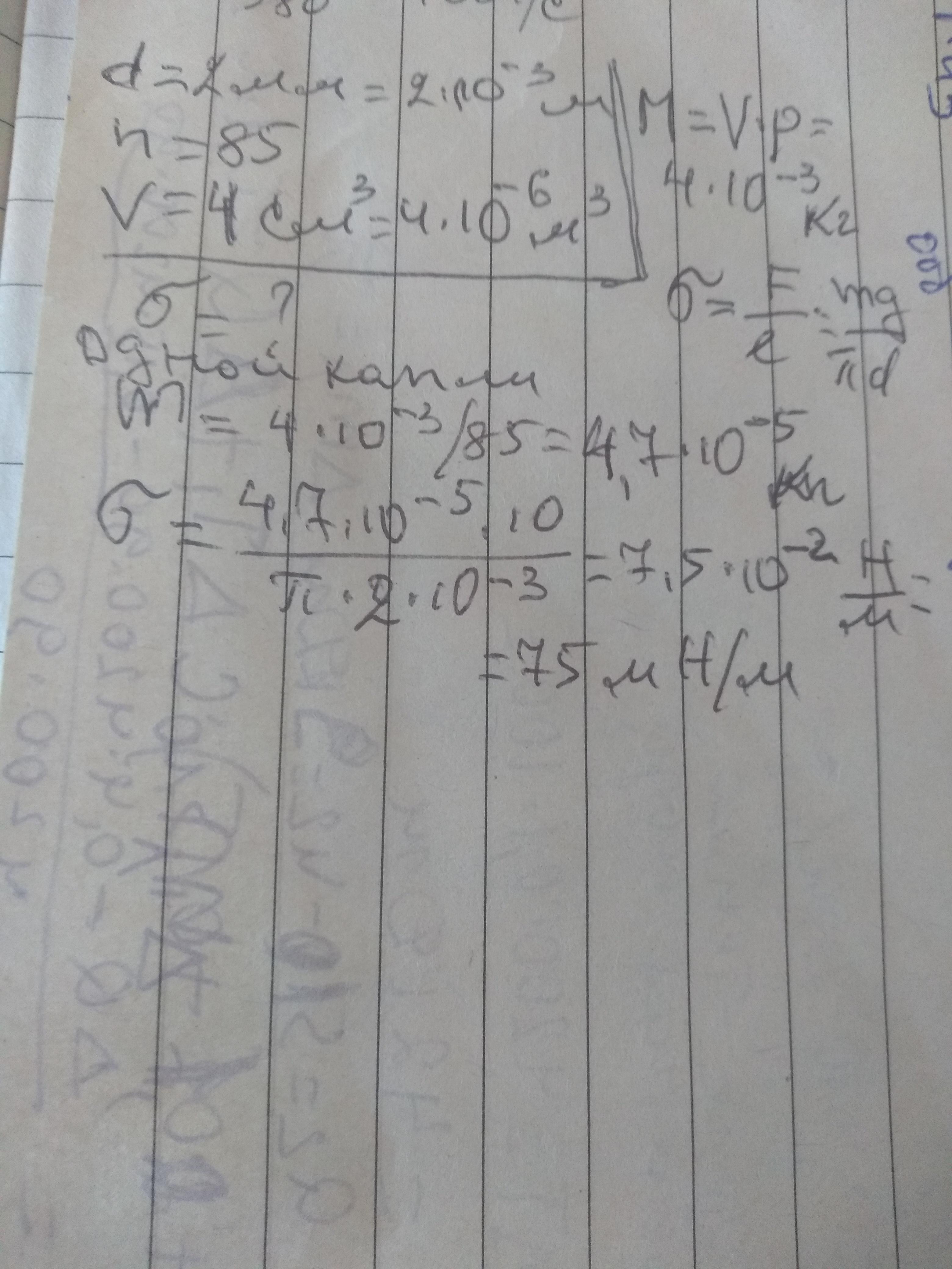 для визначення коефіцієнта поверхневого натягу води використали піпетку з діаметром вихідного отвору 2 мм. У мензурку накапали 85 крапель води загальним об'ємом 4 см^3. За даними експеременту визначте коефіцієнт поверхневого натягу води. Для цього: