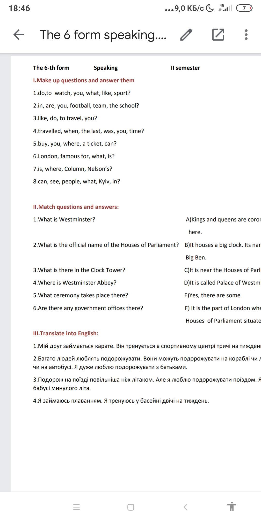 1. What sport do you like to watch? I like to watch football (или любой другой вид спорта).
