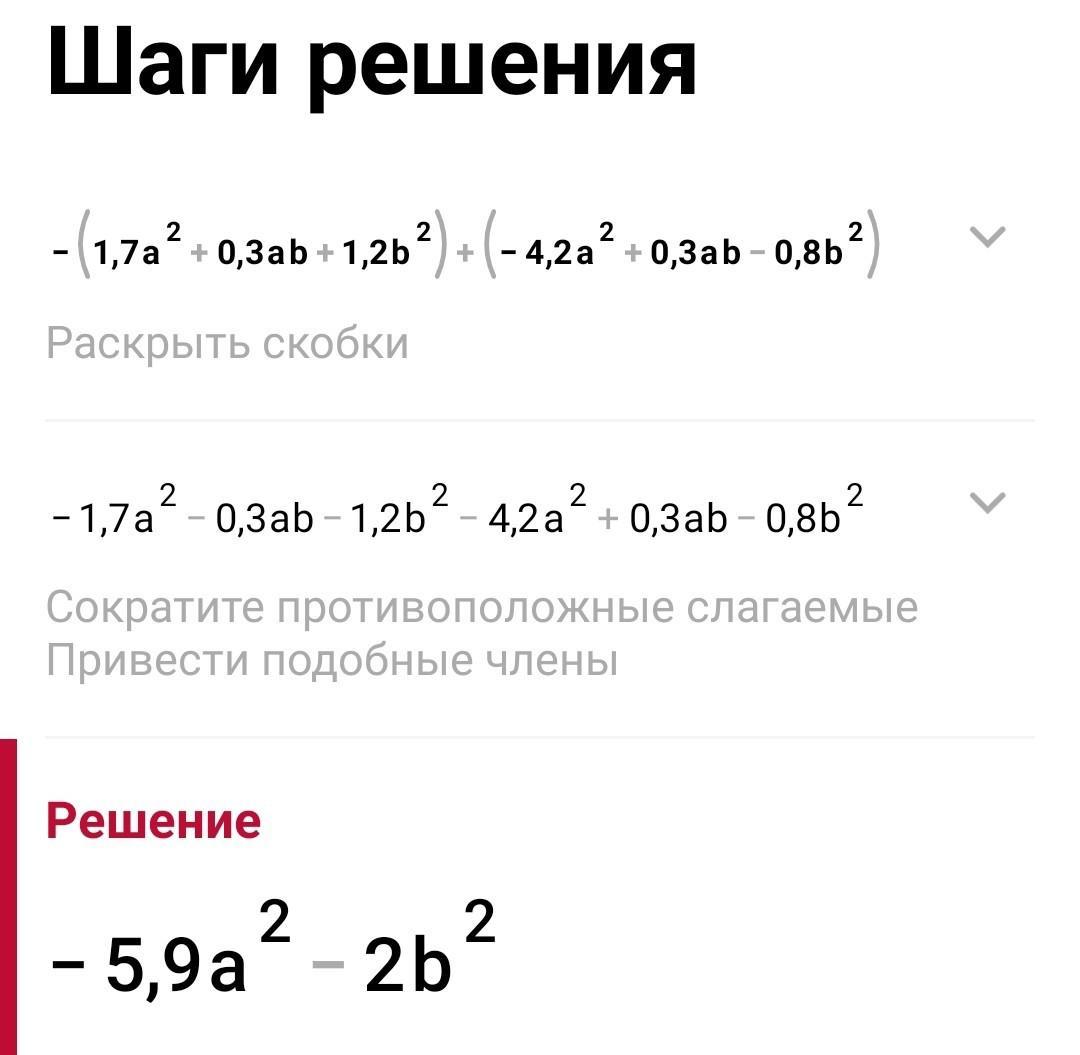 Упростите выражение -(1,7a²+0,3ab+1, 2b²)+(-4,2a²+0,3ab-0,8b²)