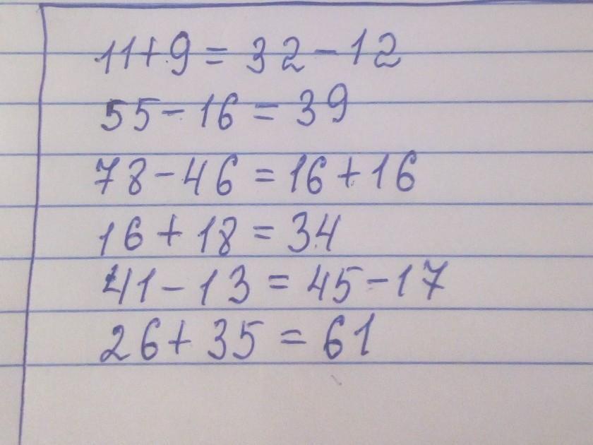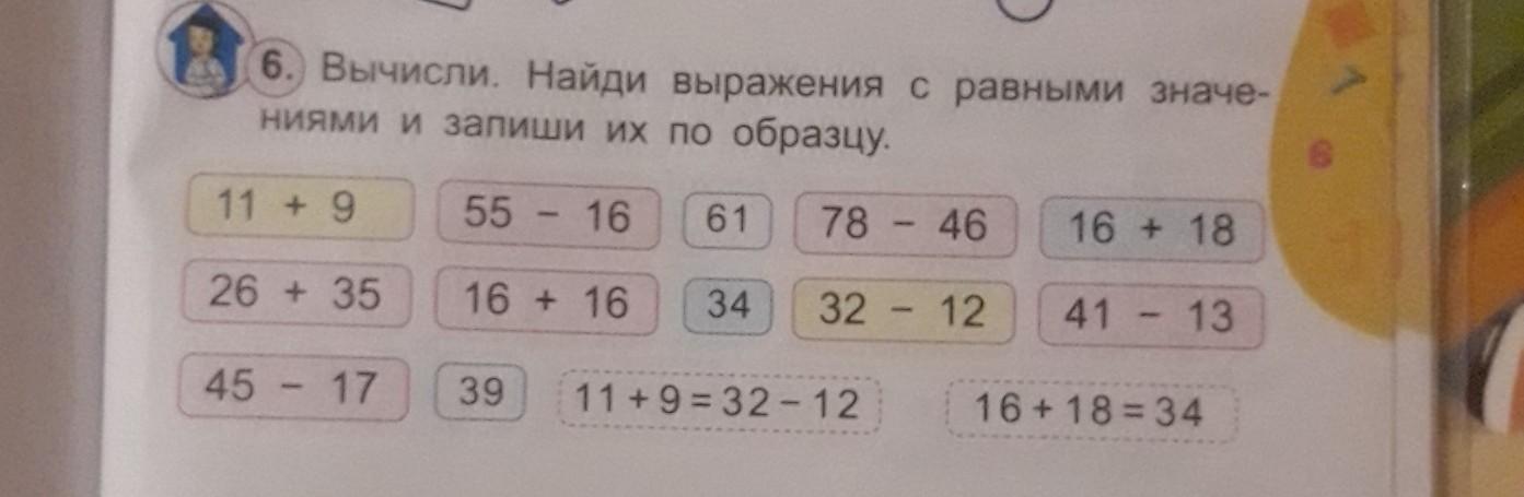 6. Вычисли. Найди выражения с равными значе- ниями и запиши их по образцу. 11 + 9 55 - 16 61 78 - 46 16 + 18 26 + 35 16 + 16 34 32 - 12 41 - 13 45 - 17 39 11 + 9 = 32 -12 16+ 18 = 34