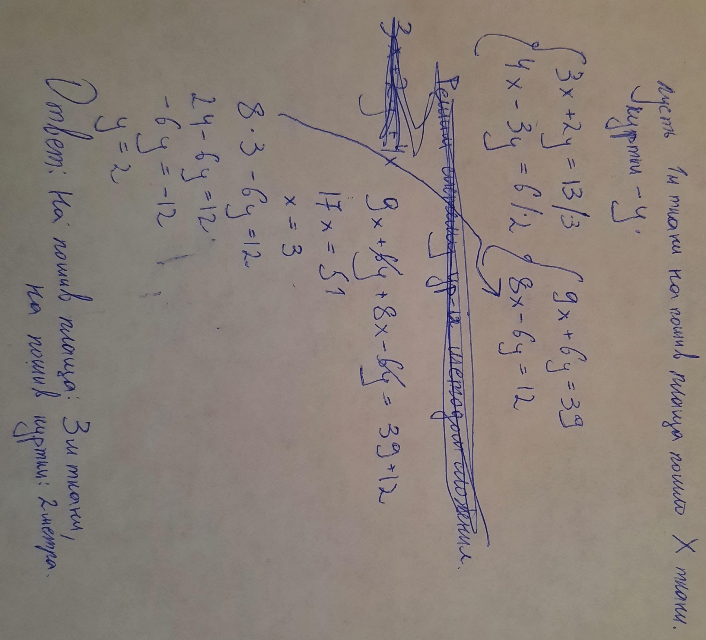 пожалуйста решите На 3 плаща и 2 куртки пошло 13м ткани, но на 4 плаща израсходовали на 6м больше ткани, чем на 3 куртки. Сколько ткани требуется на пошив плаща и сколько на пошив куртки?