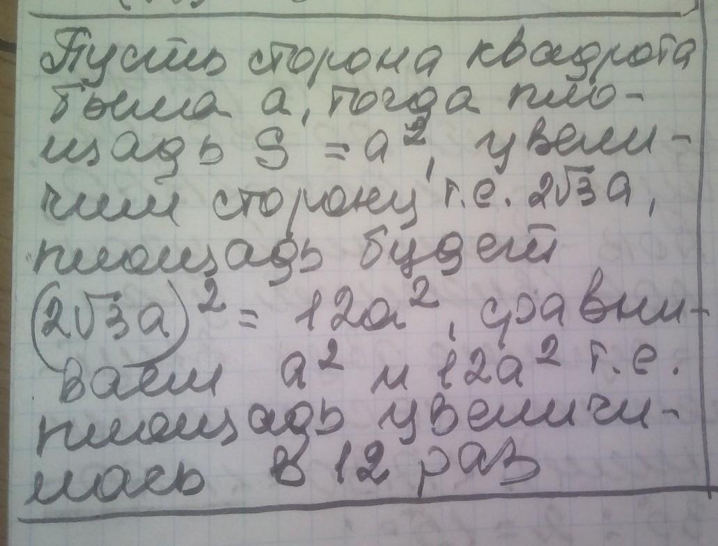 Сторону квадрата збільшили у 2√3 рази(ів). У скільки разів збільшиться його площа?