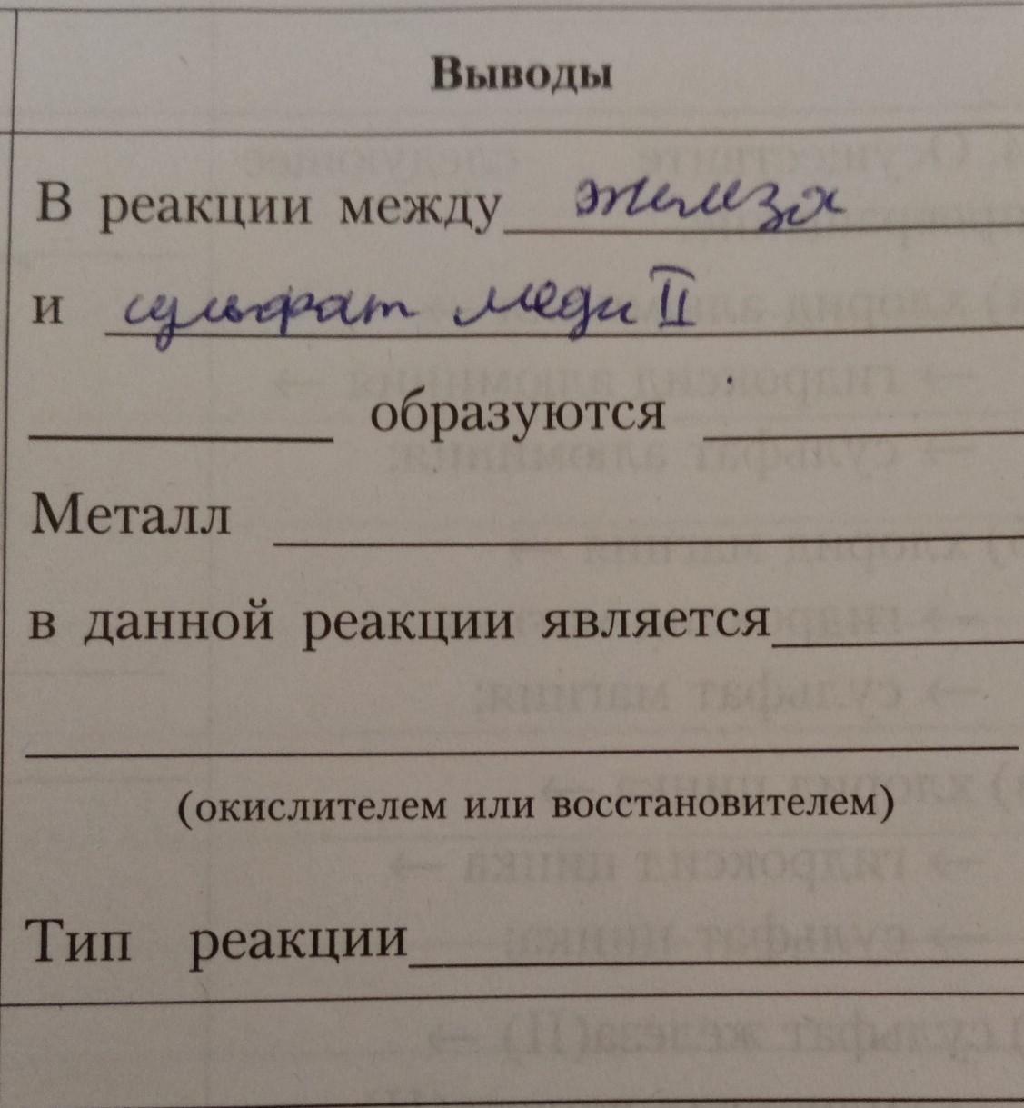 В реакции между железом и раствором сульфата меди (II) образуются медь и сульфат железа (II). Металл железо в данной реакции является восстановителем. Тип реакции: окислительно-восстановительная; реакция обмена.