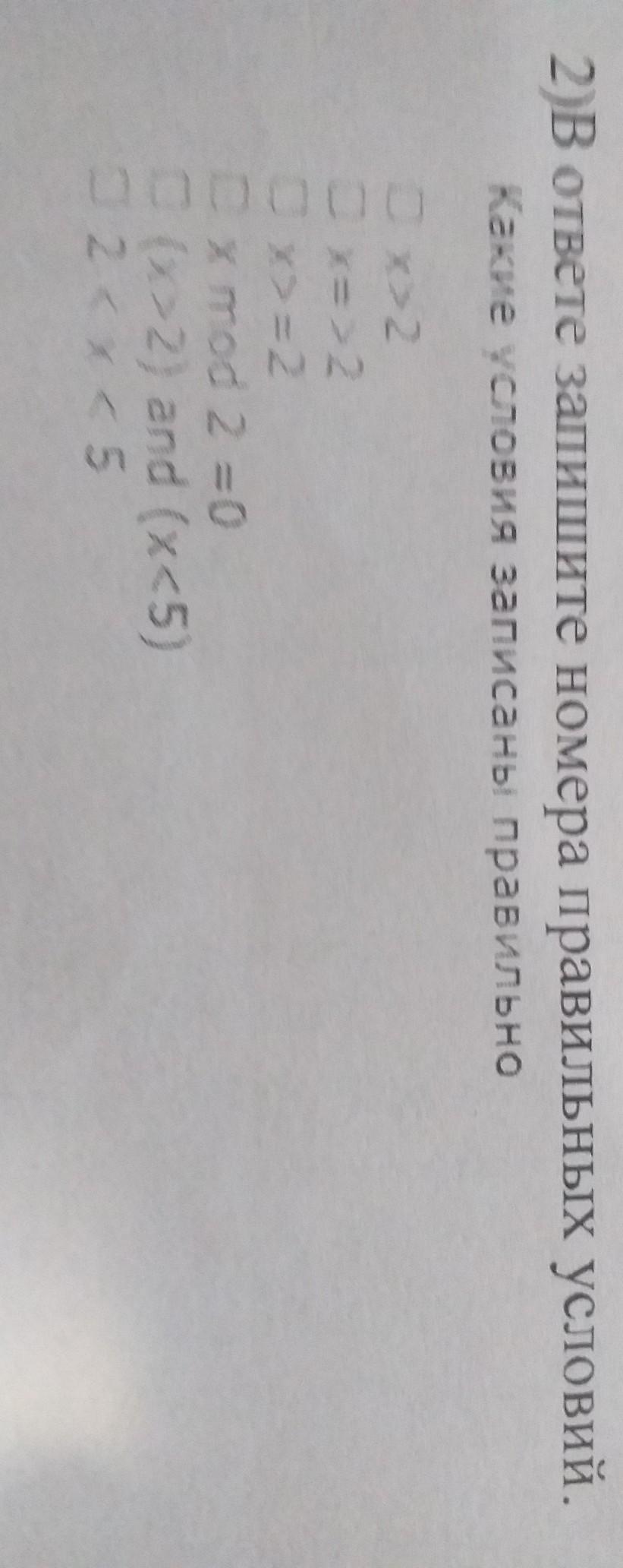 2)В ответе запишите номера правильных условий Какие условия записаны правильно x 2 Ox= 2 х5 - 2 Exmod 2 =0 0 С (х2) аnd (х