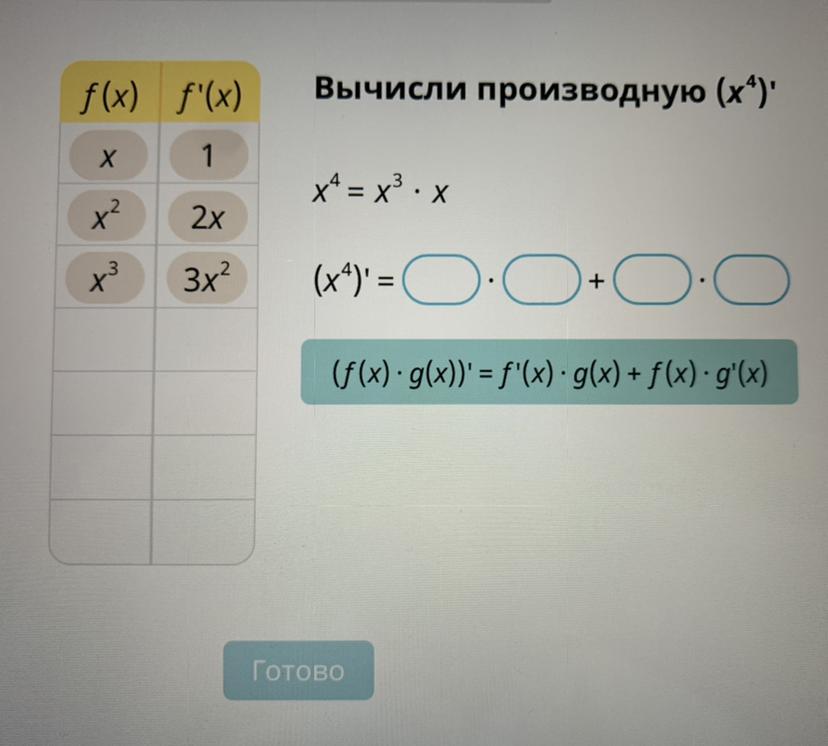f '( x ) = ( x⁴ )' = ( x³ )' * x + x³ * ( x )' = 3x² * x + x³ * 1 = 3x³ + 1 x³ = 4x³ ;