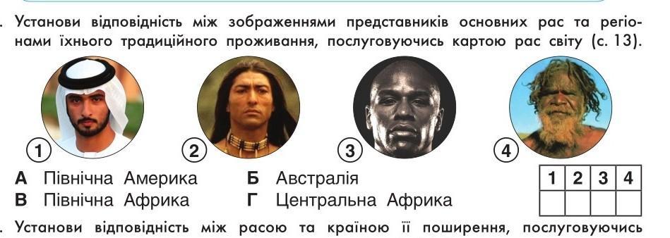 Даю 40 балів 2. Установи відповідність між зображеннями представників основних рас та регіо- нами їхнього традиційного проживання, послуговуючись картою рас світу (с. 13). 2 A Північна Америка в Північна Африка 1 2 3 4 Б Австралія гЦентральна Африка