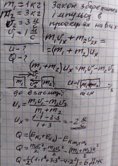 Відповідь: 1. - 2 м/с; знак " - " вказує на те, що швидкості куль після абсолютно непружного удару напрямлені у від'ємному напрямку осі x; 2. 6 Дж