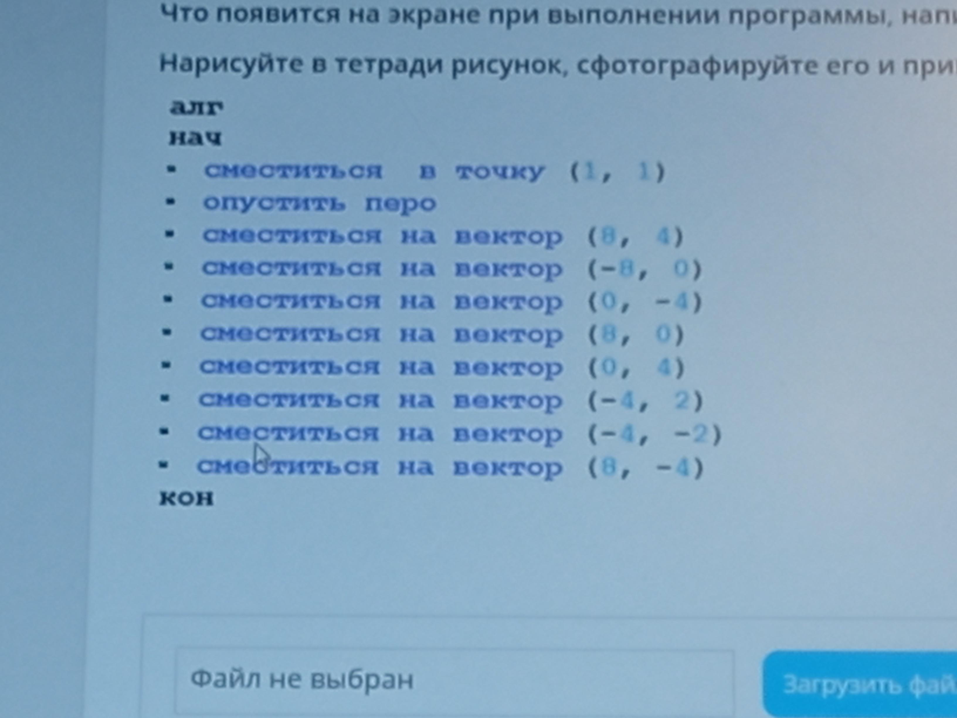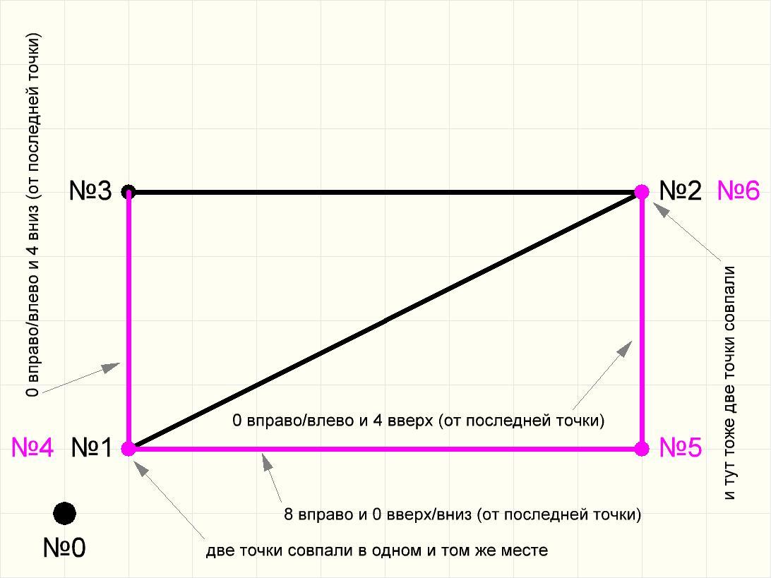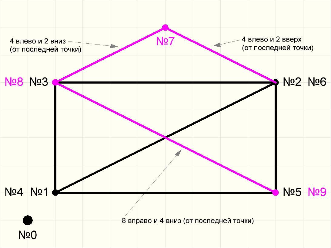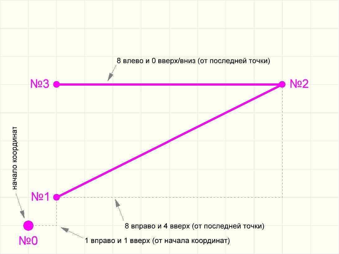 То есть, двигаемся на 8 клеток вправо, затем сразу на 4 клетки вверх, и там уже ставим точку. Если уже была команда опустить перо, то не забываем сразу соединять (по линейке) новую точку с предыдущей (с той, откуда мы начали движение в этот раз).