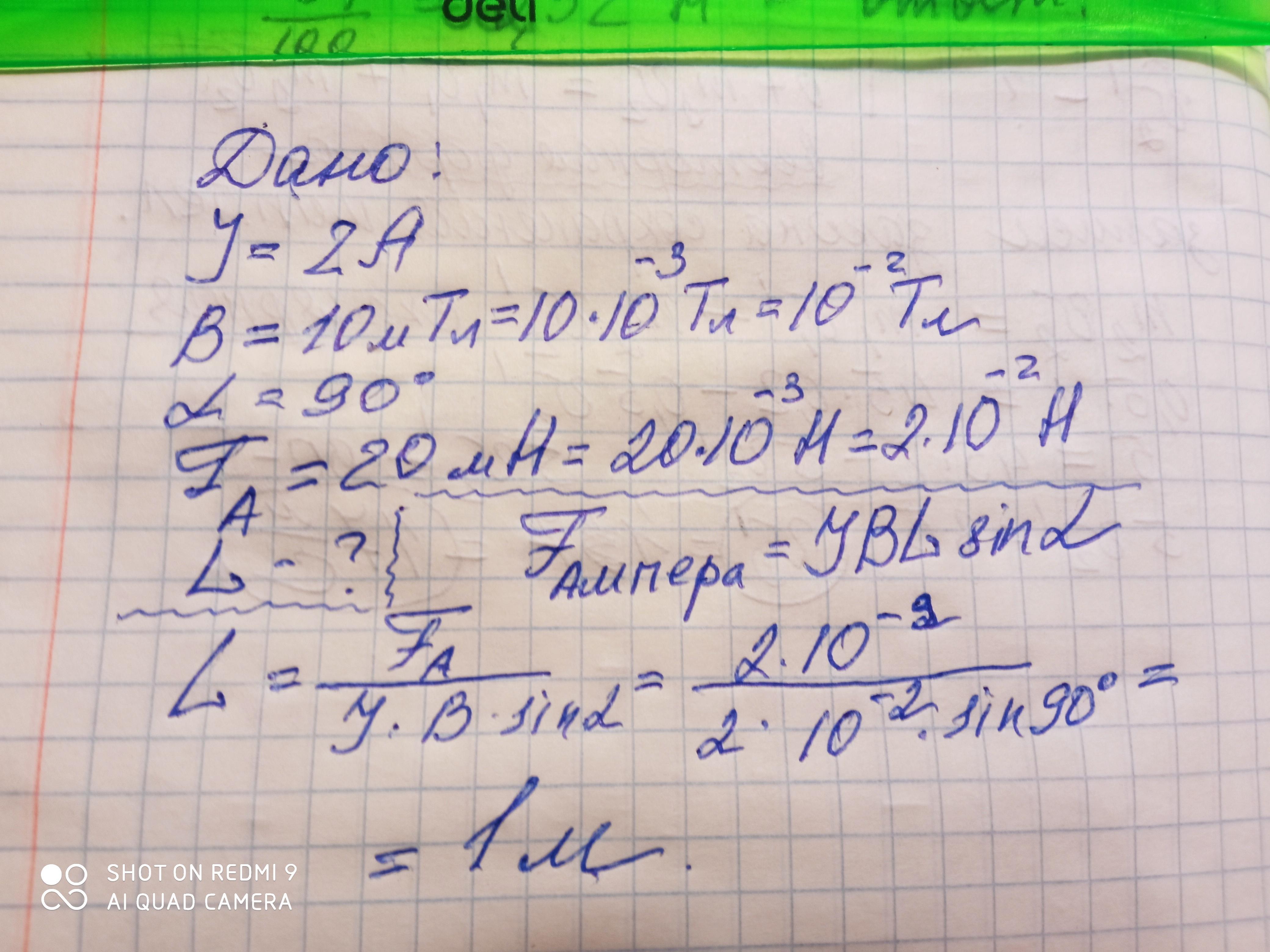 Проводник по которому течет ток 2А, помещен в магнитное поле с индукцией 10 мТл. Угол между направлением тока и вектором магнитной индукции поля 90°. Найдите длину проводника, если поле действует на него с силой 20 мН.