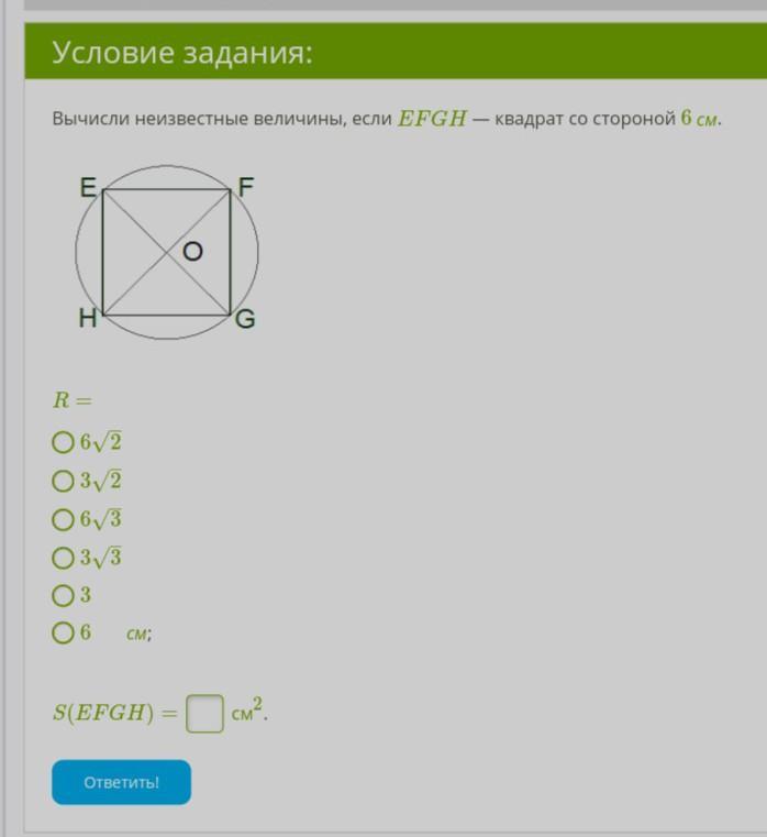 R = 0,5 · EG = 0,5 · 6√2 = 3√2 см - это второй вариант из предложенных вариантов ответа.