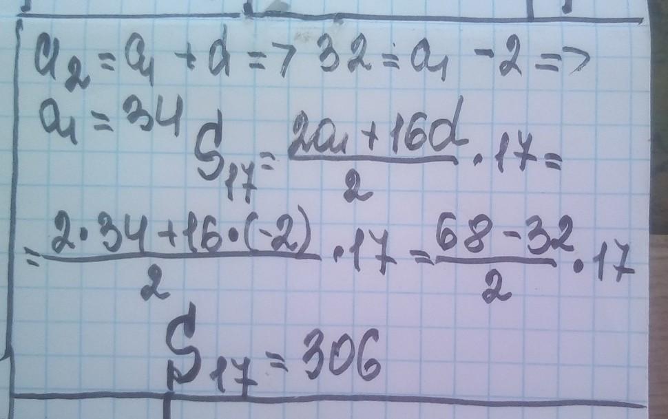 Второй член арифметической прогрессии равен 32, а ее разность равна -2. Найдите сумму первых 17 членов такой прогрессии.