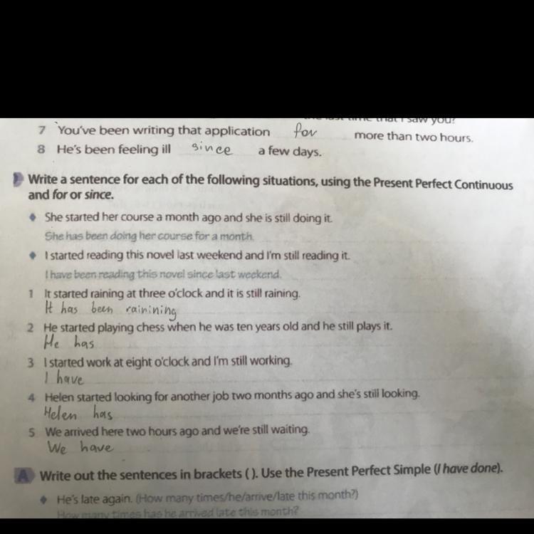 It has been raining since three o'clock.He has been playing chess since he was ten.I have been working since eight o'clock.Helen has been looking for a job for two months.We have been waiting for two hours since we arrived