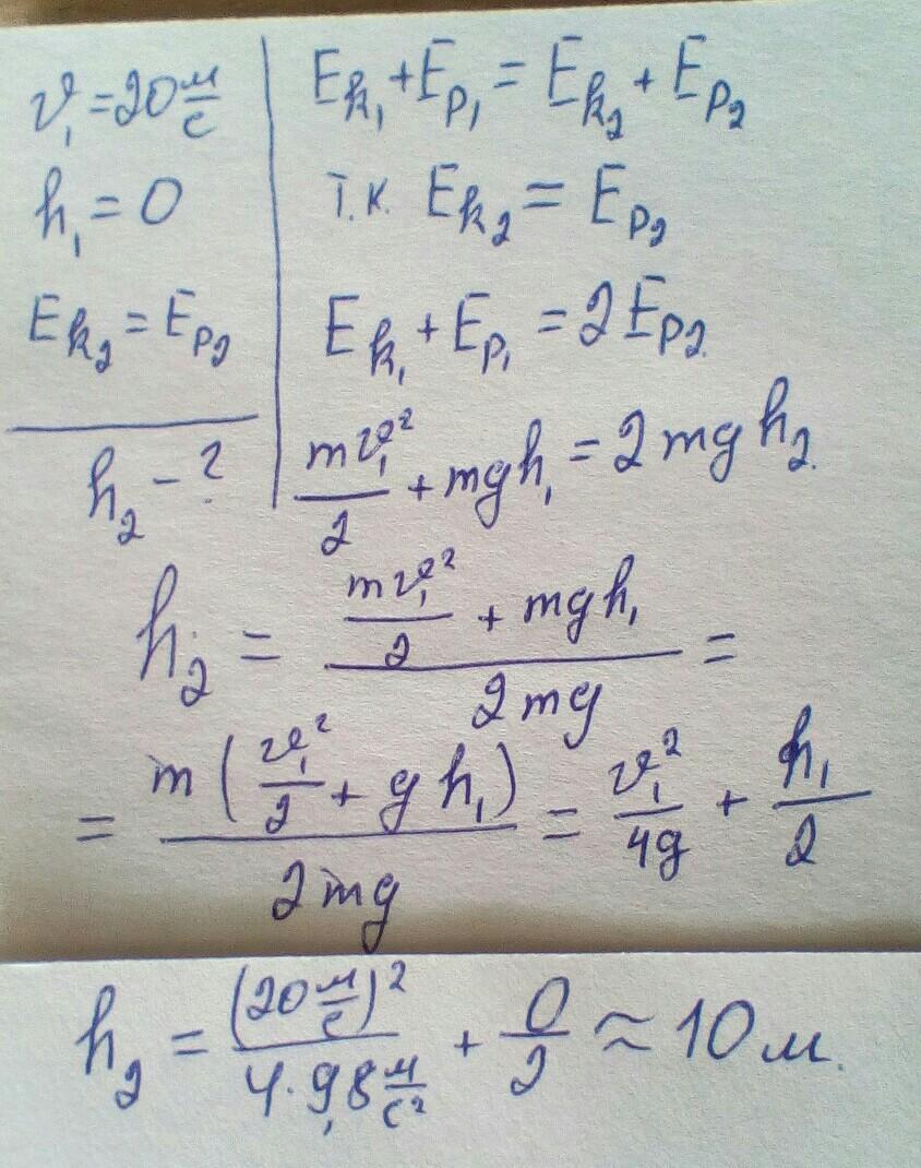 М’яч кинули вертикально вгору зі швидкістю 20 м/с. На якій висоті кінетична енергія каменя буде дорівнювати його потенціальній енергії?