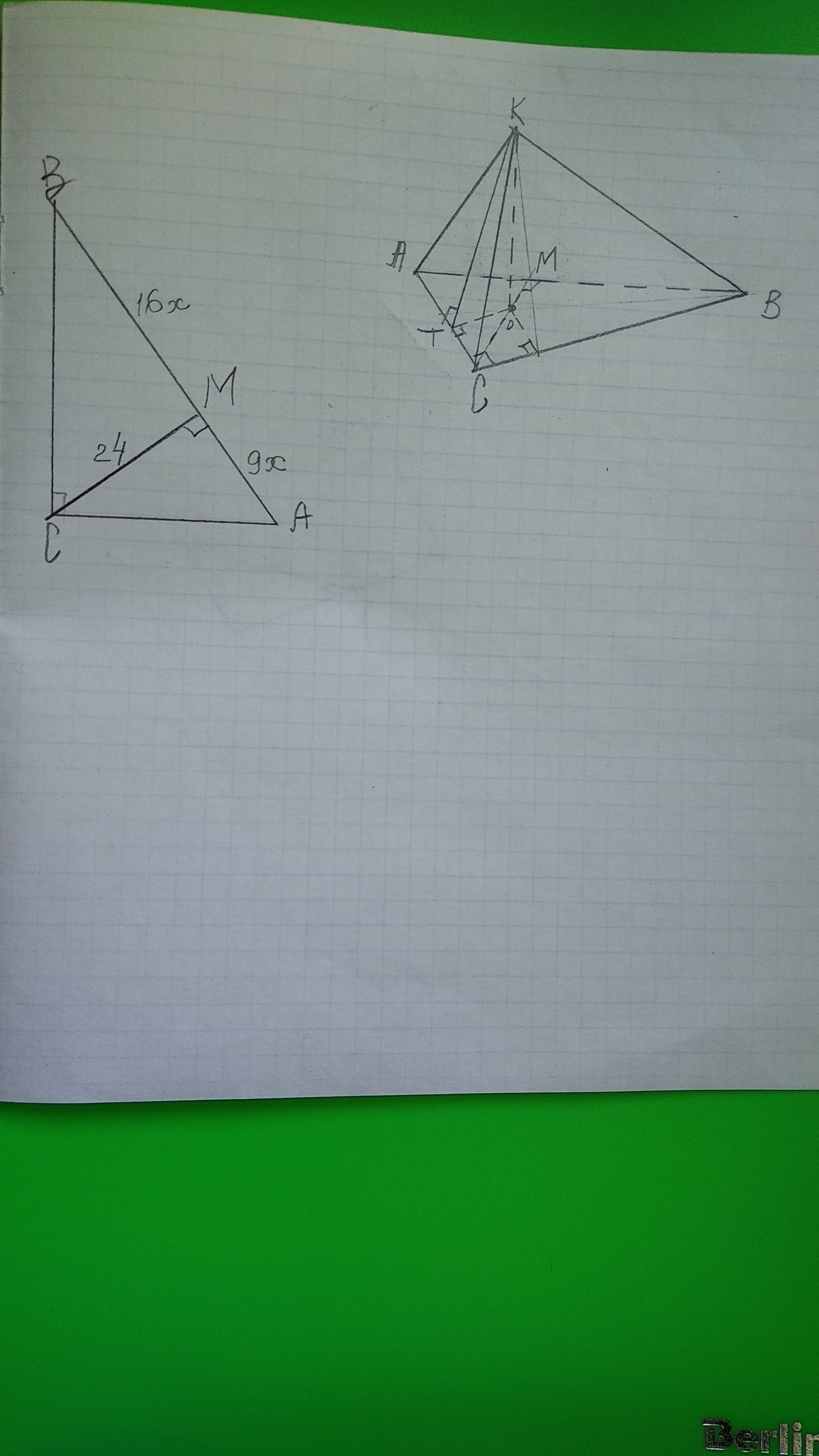 Точка К расположена от всех сторон прямоугольного треугольника на расстоянии 26см. Высота прямоугольного треугольника, проведенная к гипотенузе 24 см и делит гипотенузу в отношении 9:16. Найдите расстояние от точки К до плоскости треугольника.