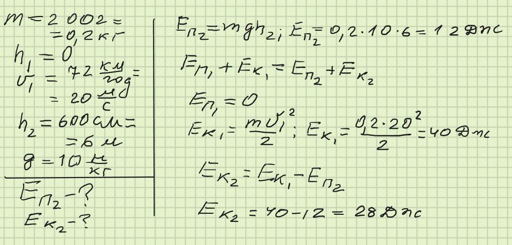 Камінь масою 200г кинули вертикально вгору зі швидкістю 72км/год. Визначте кінетичну і потенціальну енергії каменя на висоті 600см