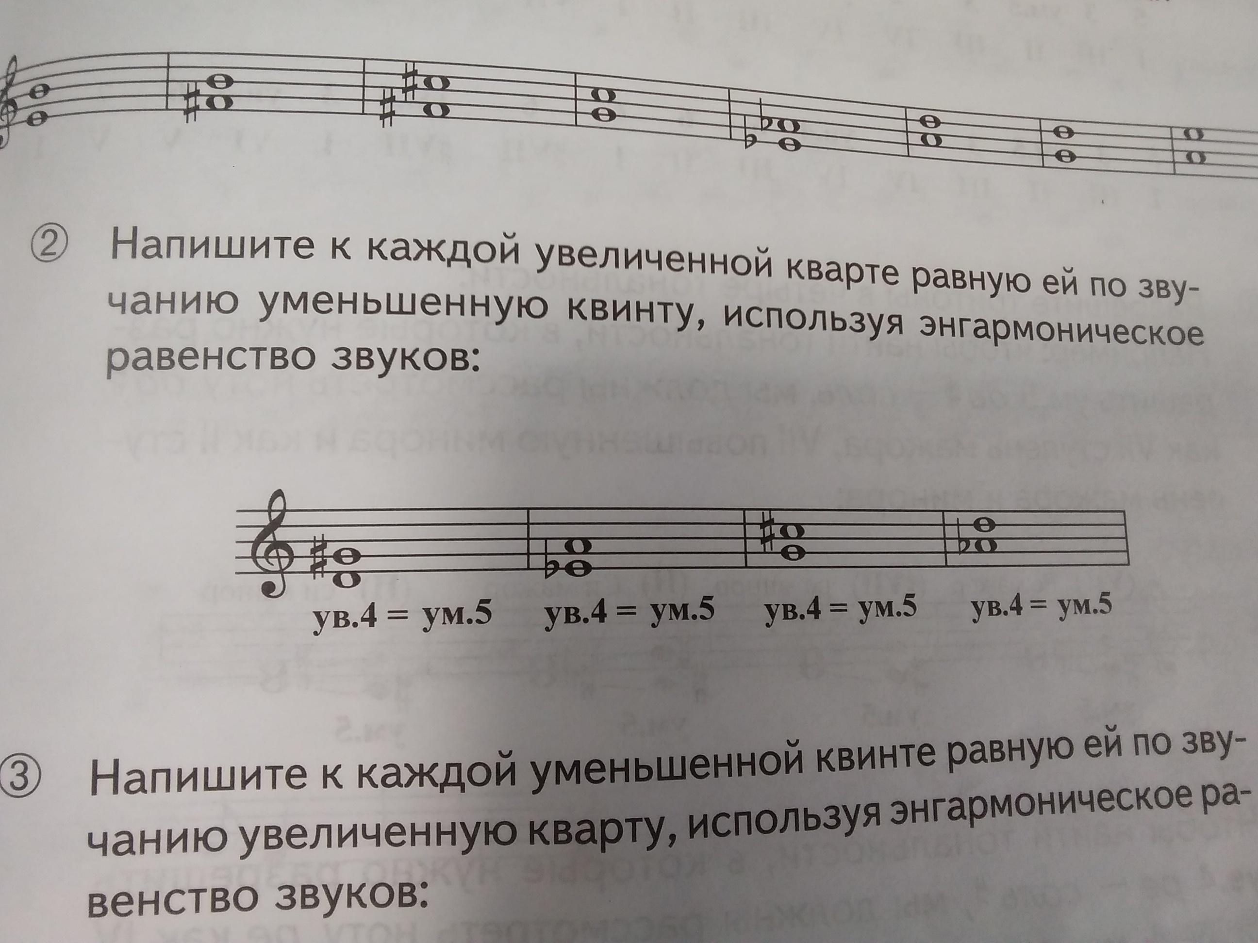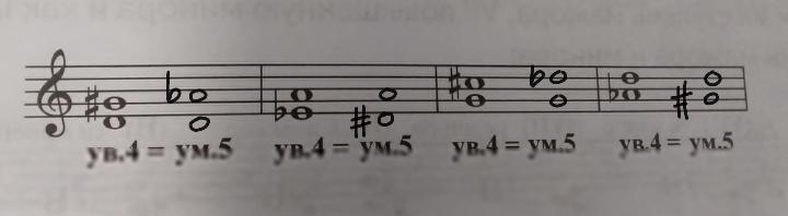 Напишите к каждой увеличенной кварте равную ей по звучанию уменьшенную квинту, используя энгармоническое равенство звуков