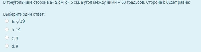 =корень ((2^2+5^2-2×2×5×1/2)=