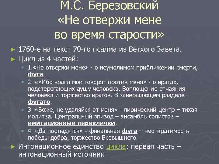Четырёхголосный хоровой концерт (d-moll) Максима Созонтовича Березовского "Не отвержи мене во время старости" написан во второй половине 1760-х гг. в области духовной музыки на библейские тексты 70-го псалма из ветхозаветной Псалтыри, большею частью на псалмы Давида.