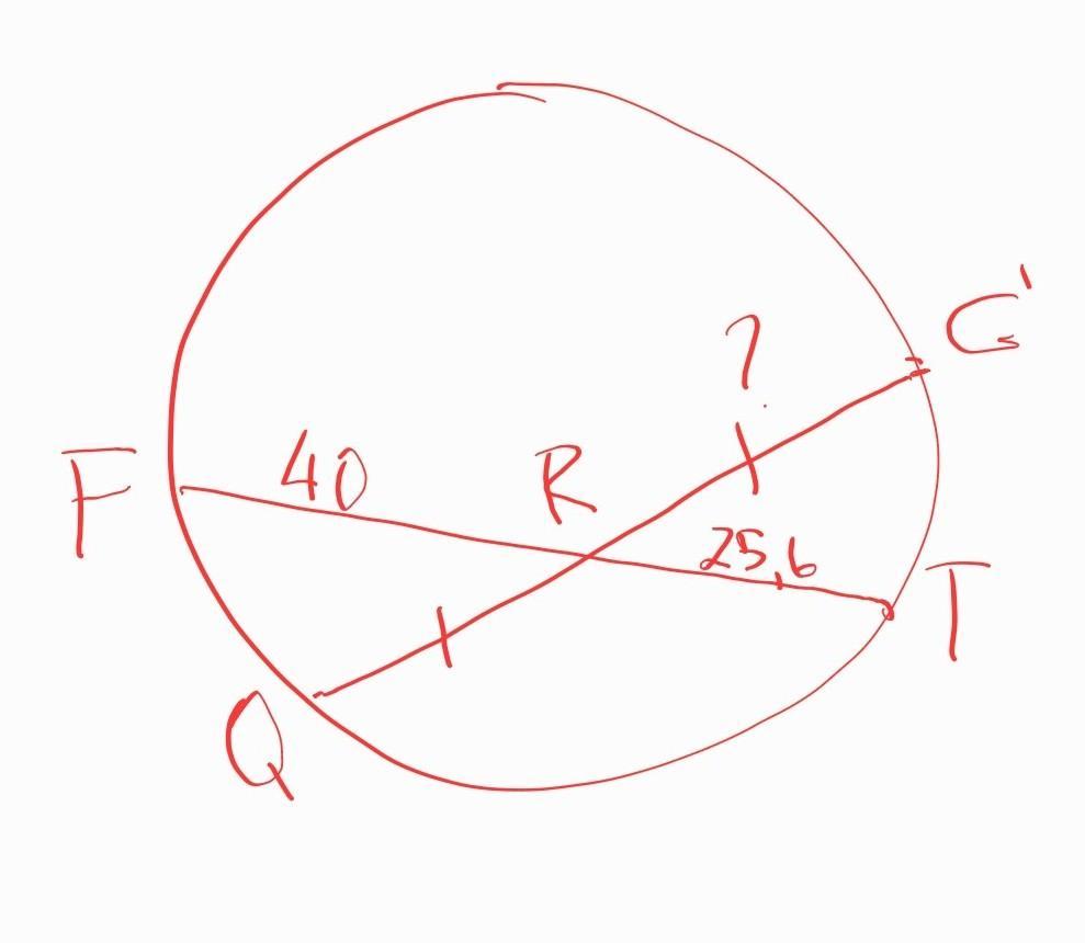 Хорды FT и QG пересекаются в точке R . Какова длина отрезка GR , если GR=RQ , RF=40 , RT = 25,6 ?