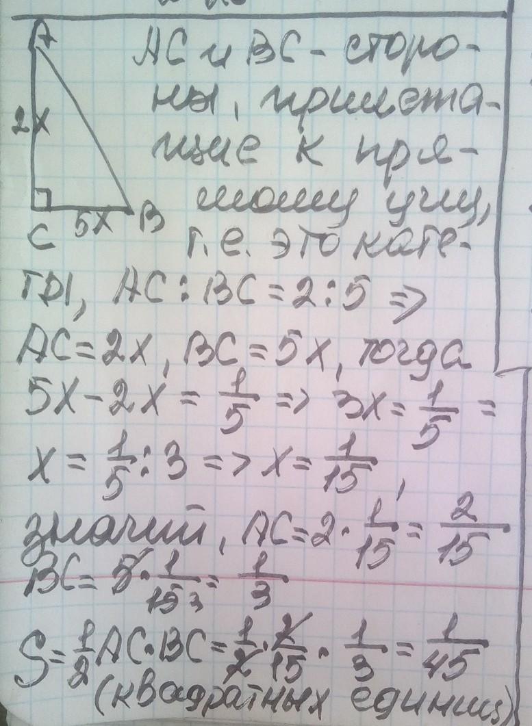 Известно, что стороны, прилегающие к прямому углу треугольника, относятся как 2 : 5, а их разность равна 1/5. Найдите площадь этого треугольника