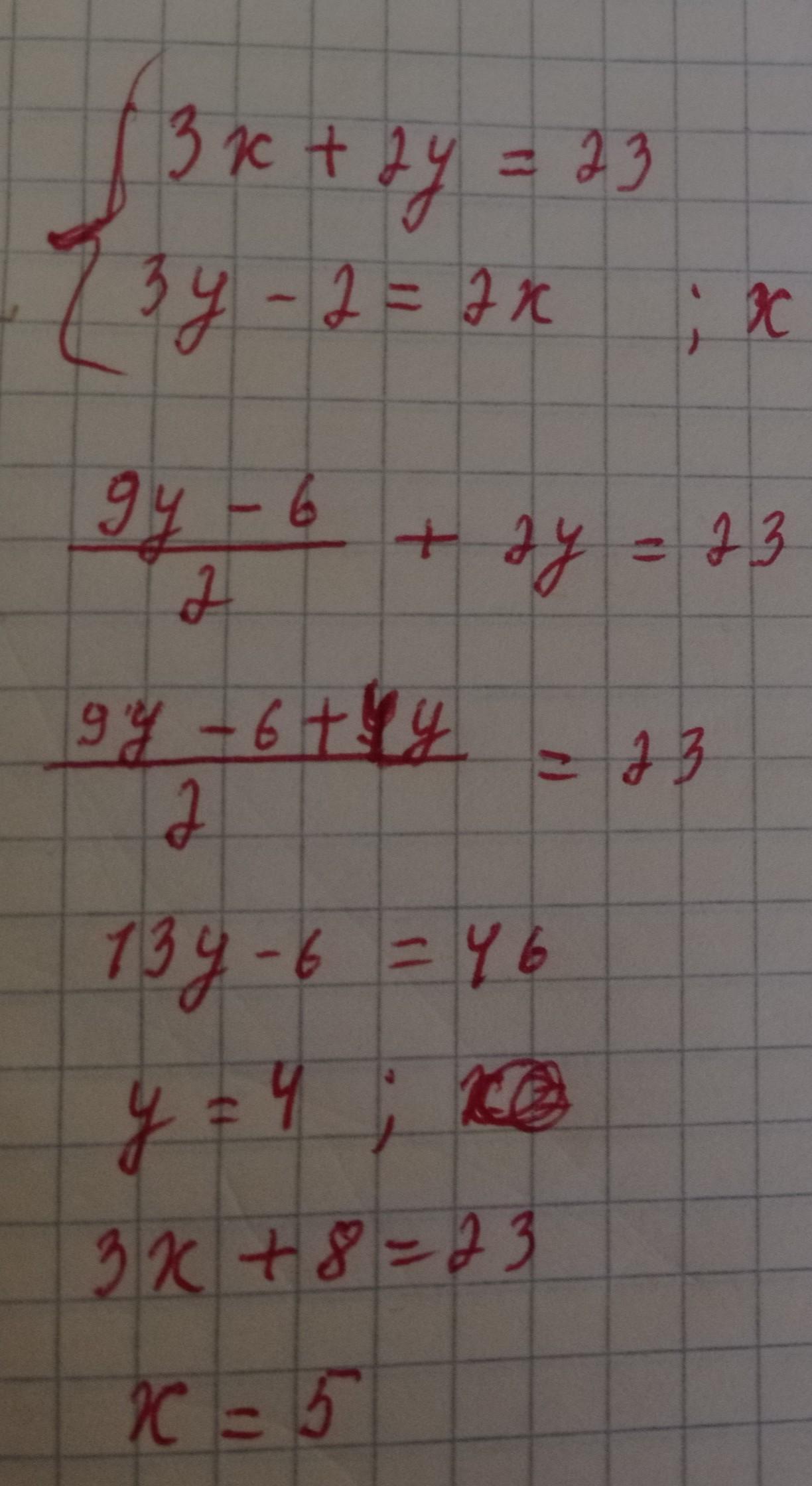 Две бригады работали на сборе яблок. В первый день одна бригада работала 3ч, а вторая - 2ч, причем вместе они собрали 23ц яблок. На следующий день первая бригада за 2ч собрала на 2ц яблок меньше, чем вторая за 3ч. Сколько центнеров яблок собирала каждая бригада за 1ч.