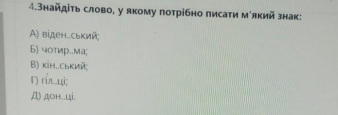 4.Знайдіть слово, у якому потрібно писати м'який знак: А) віденський; Б) чотир..ма; В) кінський; Г) гілці; Д) дон..ці.