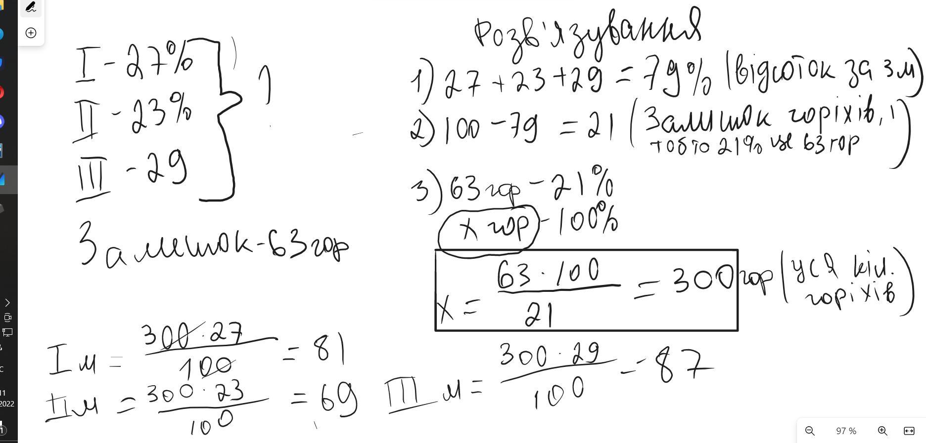 Першого місяця білка зїла 27%запасу горіхів ,другого-23%,третього-29% усього запасу.Після цього в неї залишилося ще 63 горіхи.Скільки горіхів заготувала білка й скільки горіхів вона зїжала щомісяця?
