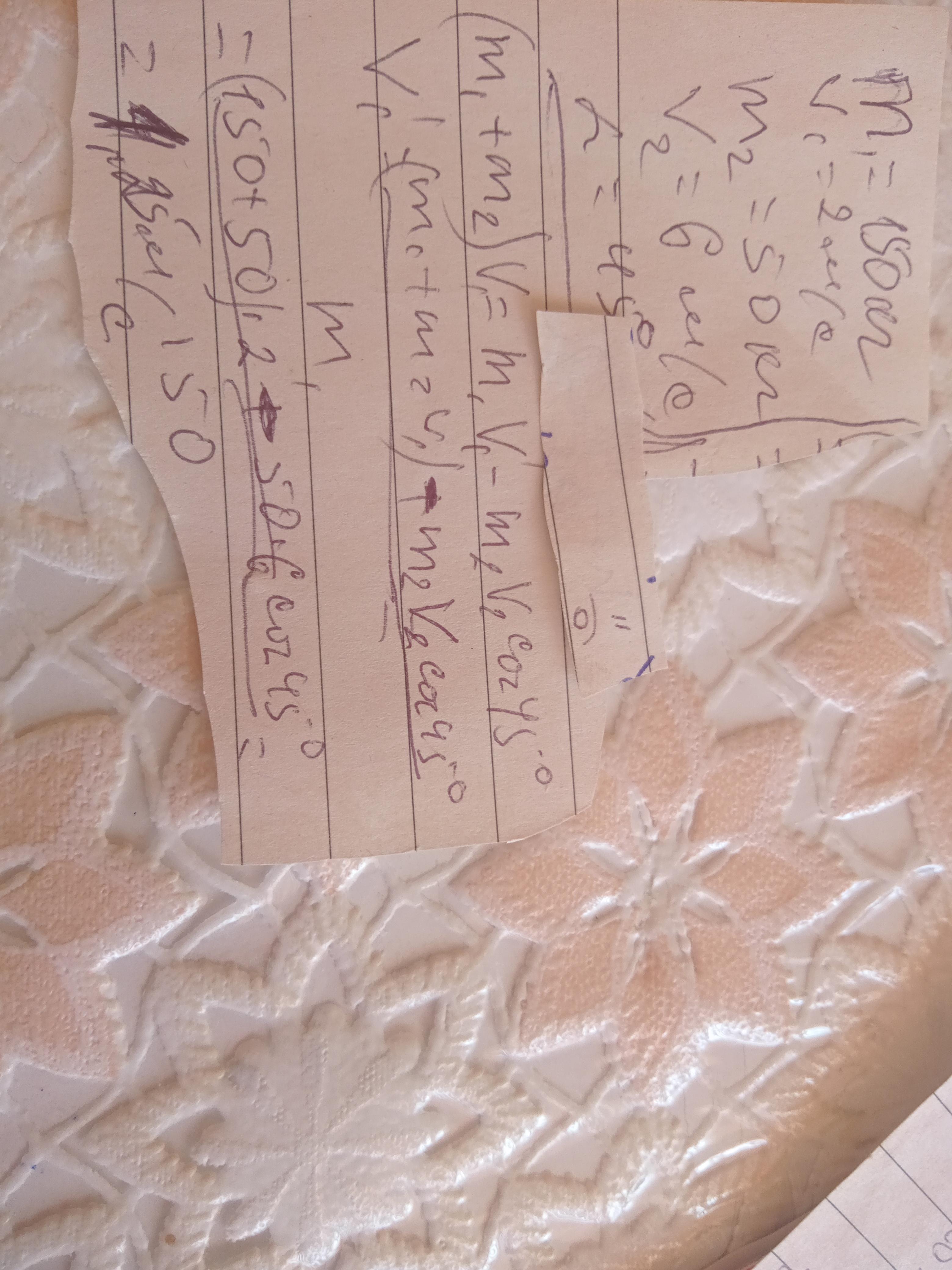 Із човна масою 150 кг , який рухається зі швидкістю 2 м с , у горизонтальному напрямку зі швидкістю відносно землі 6 м с стрибає хлопчик масою 50 кг. Яку швидкість у м с буде мати човен після стрибка, якщо хлопчик стрибає з носа човна в напрямку руху човна? Вважайте, що швидкість хлопчика напрямлена під кутом 45 до горизонту.