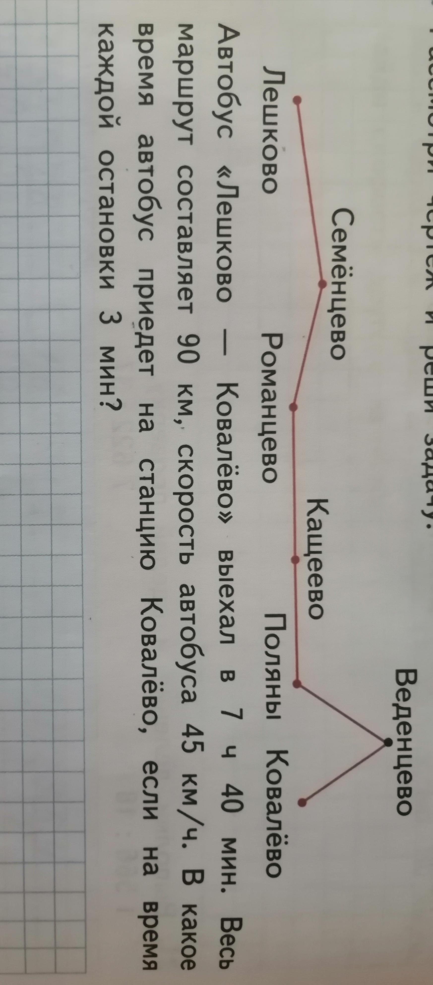 Автобус "Лешкого-Ковалёво" выехал в 7 ч 40 мин. Весь маршрут состовляет 90 км, скорость автобуса 45 км/ч. В какое время автобус приедет на станцию Ковалёво, если на время каждой остановки 3 мин.